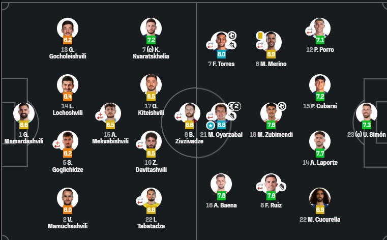 სტატისტიკური გვერდის Sofascore-ს მიხედვით ჩვენს ნაკრებში საუკეთესო ხვიჩა კვარაცხელია იყო, რომელმაც 10-დან 7.2 ქულა მიიღო.