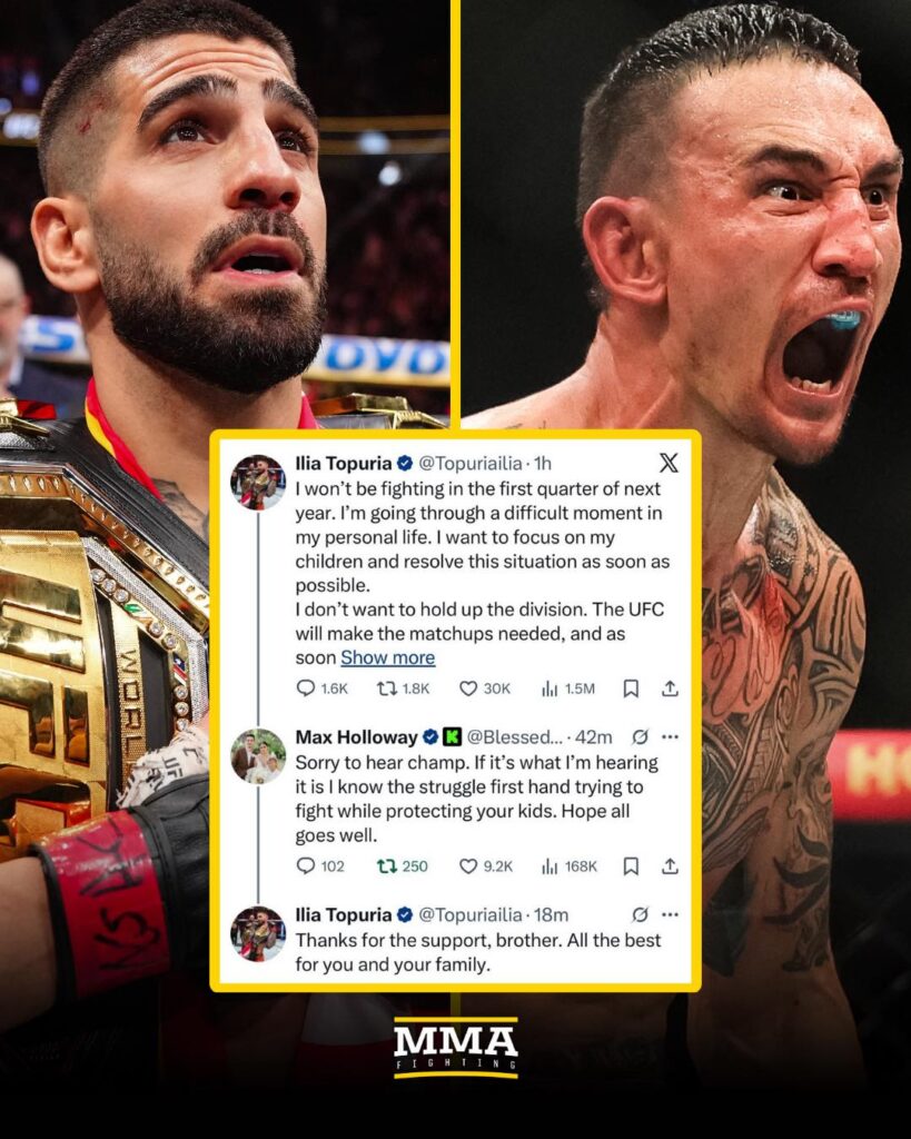 UFC-ის მსუბუქი წონის ჩემპიონმა, ილია თოფურიამ UFC-ში თავის სამომავლო გეგმებთან დაკავშირებით განცხადება გააკეთა. როგორც „ელ მატადორი“ სოციალურ ქსელში წერს, მას ახლა პირად ცხოვრებაში რთული პერიოდი აქვს.