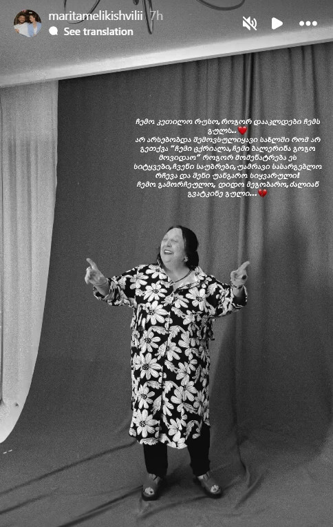 „ჩემო კეთილო რუსო, როგორ დააკლდები ჩემს გულს.. არ არსებობდა შემოსულიყავი სახლში რომ არ გეთქვა „ჩემი ცქრიალა, ჩემი ბალერინა გოგო მოვიდაო” როგორ მომენატრება ეს სიტყვები, ჩვენი საუბრები, უამრავი სასარგებლო რჩევა და შენი უანგარო სიყვარული! ჩემო გამორჩეულო, დიდო მეგობარო, ძალიან გვატკინე გული…“, – წერს მარიტა მელიქიშვილი.