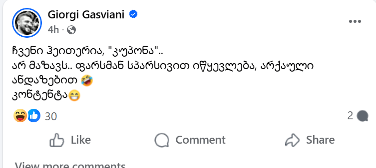 ტელეწამყვანი გიორგი გასვიანი ტელეკომპანია “იმედის” გარშემო განვითარებულ მოვლენებს ეხმაურება და სოციალურ ქსელში რამდენიმე პოსტს აქვეყნებს.