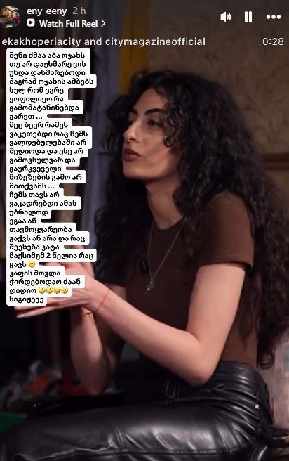 შენი ძმაა, აბა, ოჯახს თუ არ დაეხმარე, ვის უნდა დახმარებოდი. მაგრამ ოჯახის ამბებს, სულ რომ ეგრე ყოფილიყო, რა გამომატანინებდა გარეთ. მეც ბევრ რამეს ვაკეთებდი, რაც ჩემს ვალდებულებაში არ შედიოდა და ასე არ გამოვსულვარ და გაურკვეველი მიზეზების გამო არ მითქვამს. ჩემს თავს არ ვაკადრებდი ამას. უბრალოდ ეგაა, თავმოყვარეობა გაქვს, ან – არა. და რაც შეეხება კატას, მაქსიმუმ ორი წელია, რაც ჰყავს. კატას მოვლა სჭირდებოდა ძალიან დიდიო, სიგიჟეა”, – წერს ენი გასოევა.